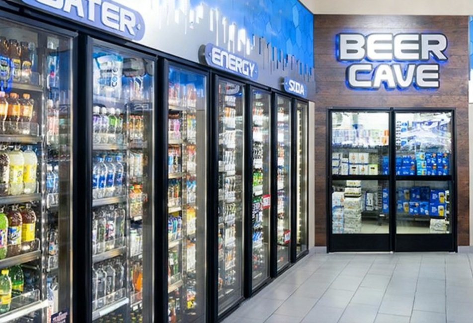 The glass door leads into the cooler